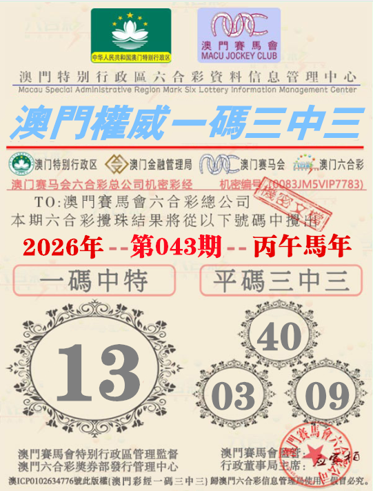 043期:【澳门权威资料】√一码三中三√ 澳门权威精准资料